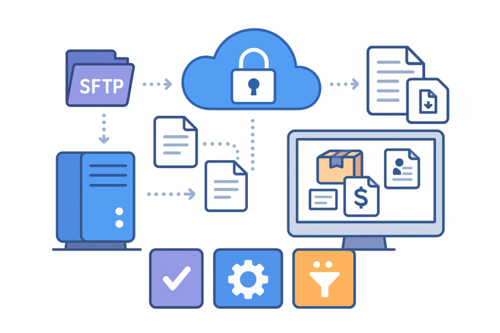 The connector is designed for file-driven exchange over SFTP rather than APIs. Data moves in structured text files through a managed FileZilla channel, ensuring predictable transfer windows and clear separation between staging and ERP posting.