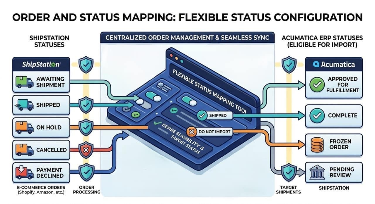 The system centralizes order management by seamlessly syncing orders across platforms. It features a flexible status mapping tool that allows you to specify exactly which ShipStation order statuses (such as Awaiting Shipment, Shipped, or On Hold) are eligible to be imported into Acumatica
