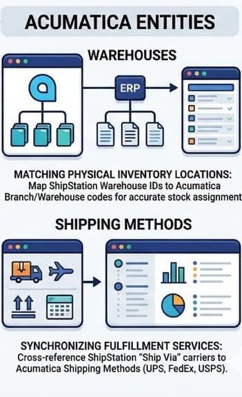 To ensure logistical accuracy, the integration includes specialized cross-reference options that match specific entities between the two platforms. Users can enable cross-referencing to perfectly map Warehouses and Shipping Methods (Ship Via) between ShipStation and Acumatica